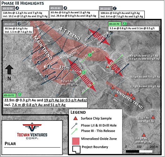 Figure 1. Plan Map highlighting the results from the latest stage of drilling at Pilar.