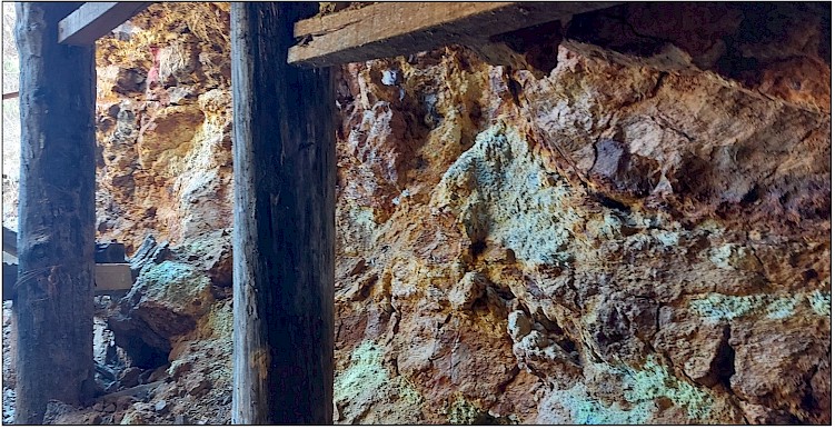 Figure 1. Intense wallrock alteration and primary sulphide to secondary oxide mineralization exposed at the entry to workings at the Pillado drill target.