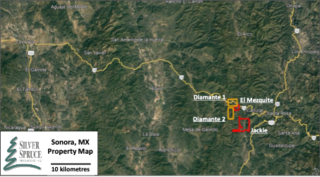Figure 4. Jackie Concession Location Map. Note adjacent El Mezquite and Diamante 1 and 2.