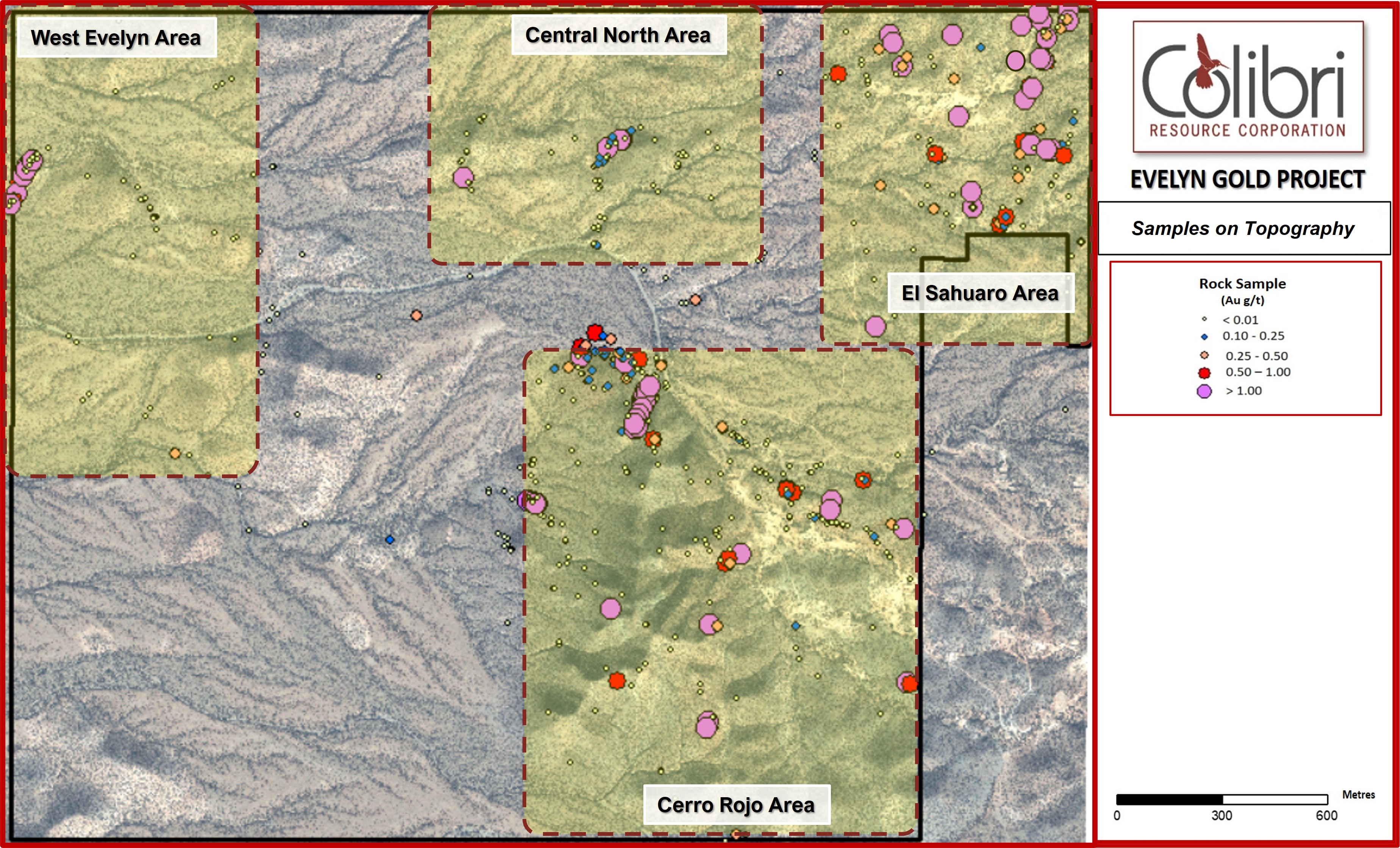 NEWS RELEASE - Dieppe, NB., October 12th, 2021 - Colibri Resource Corporation (CBI-TSXV) ("Colibri" or the "Company") is pleased to announce that a permit to drill up to 56 holes at the Evelyn Gold Project, located in northern Sonora, Mexico has been received. The application was submitted to SEMERNAT (the Mexican environmental authority) on September 3rd, 2021, and permission was granted October 5, 2021. The Company continues to complete geological mapping and sampling to refine drill targets and reports an assay of 33 grams per tonne (“g/t”) Au and 119 g/t Ag.