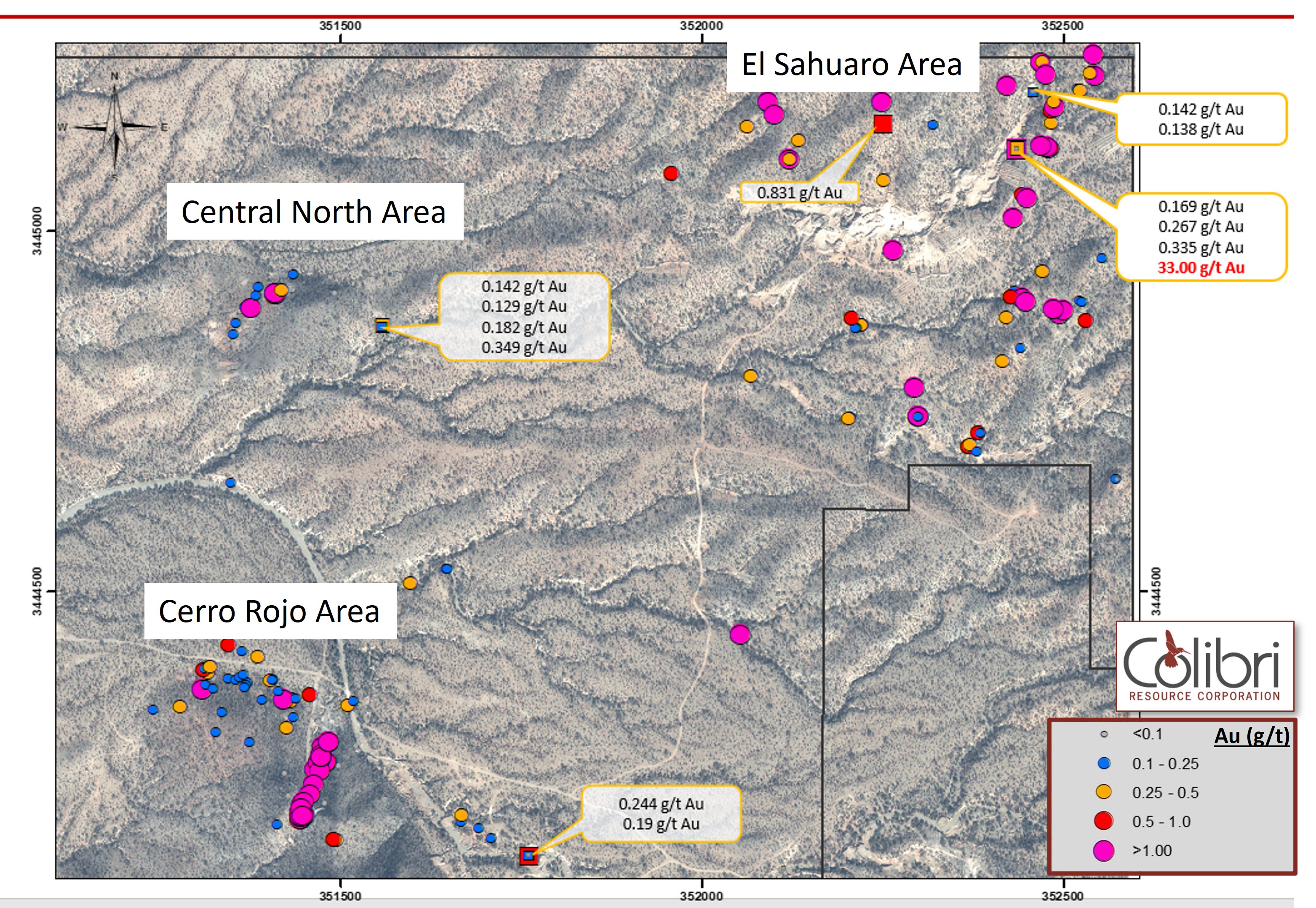 Figure 2 – Newly Taken Gold Samples on Topography – Cerro Rojo, Central North, and El Sahuaro