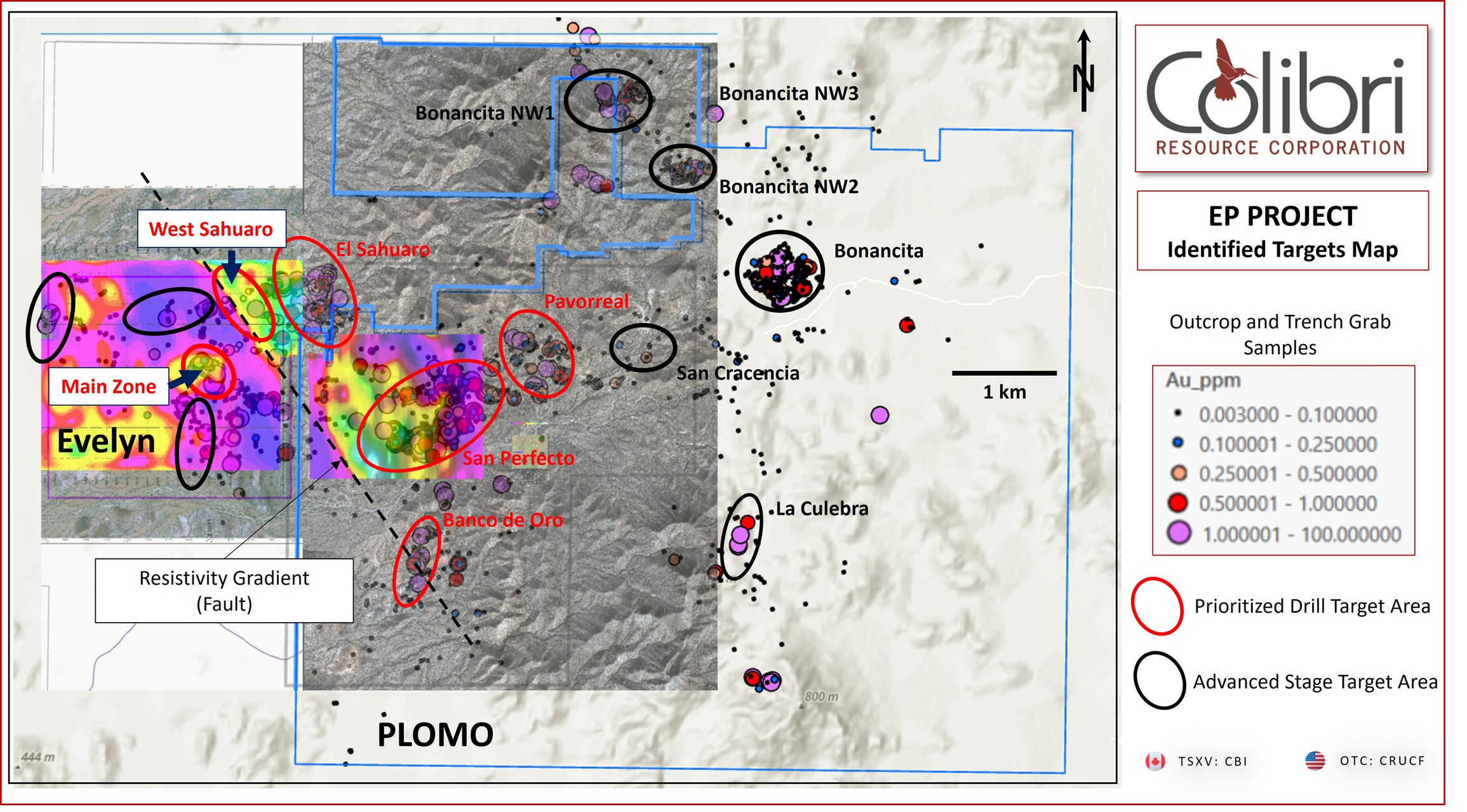 NEWS RELEASE - Dieppe, NB., August 22, 2024 - Colibri Resource Corporation (TSX.V:CBI) (OTC:CRUCF) ("Colibri" or the "Company") is pleased to report the results of geological mapping and outcrop sampling recently completed on the Plomo property at the EP gold project located in the Caborca Gold Belt, NW Sonora. Highlights include outcrop grab samples which returned values up to 2.99 grams per tonne (“g/t”) Au which extend the footprint of surface mineralization at the San Perfecto target approximately 350 meters (“m”) and samples from La Culebra target area that returned values up to 4.64 g/t Au occurring over a strike length of approximately 650 m.