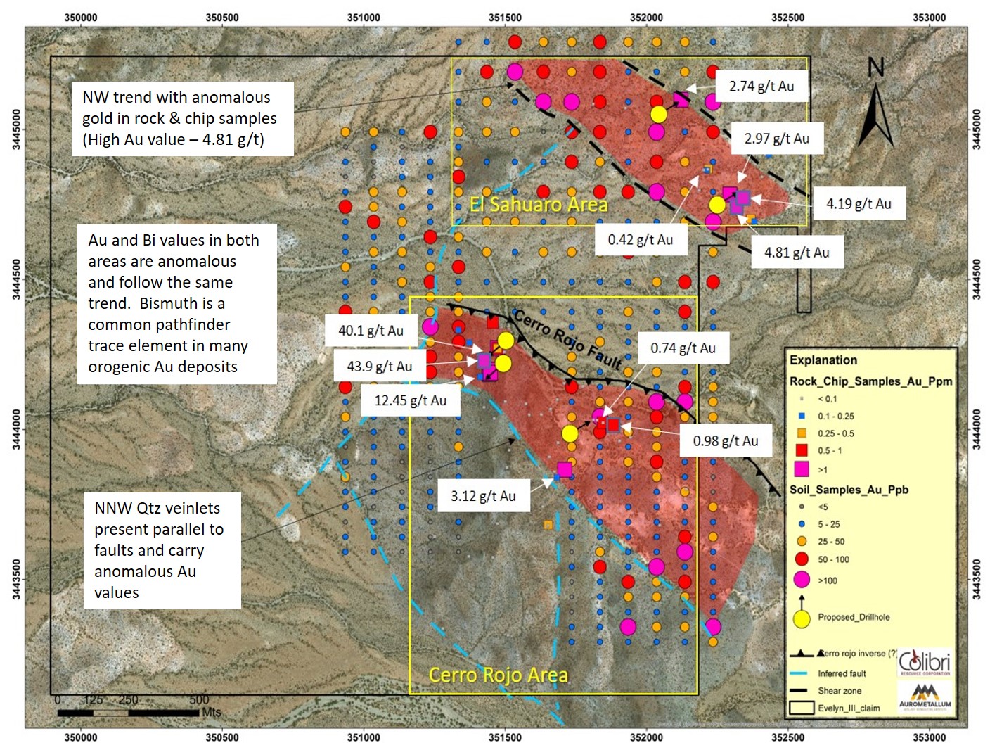 The initial 5 hole diamond drilling program will focus on testing the high priority targets that were selected by Aurometallum Geology Consulting Services and Colibri geologists. Aurometallum completed a geological, geochemical, and structural mapping study at Evelyn in late 2019 and has identified two mineralized corridors of strong initial interest. These corridors have now been named "Cerro Rojo" and "El Sahuaro" (CBI press release December 3, 2019).